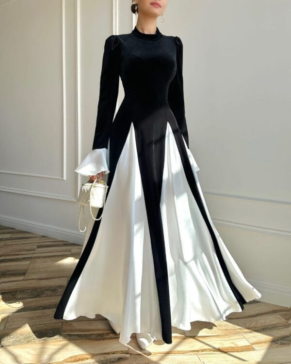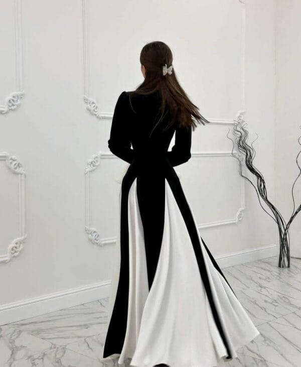 فستان راقٍ طويل بتصميم فاخر وأنيق يجمع بين الكلاسيكية والعصرية، مصنوع من قماش مخملي أسود فاخر يمتد بانسيابية إلى تنورة واسعة تتخللها قطع ساتان بيضاء بشكل مثلثات انسيابية تمنح الحركة جاذبية استثنائية.