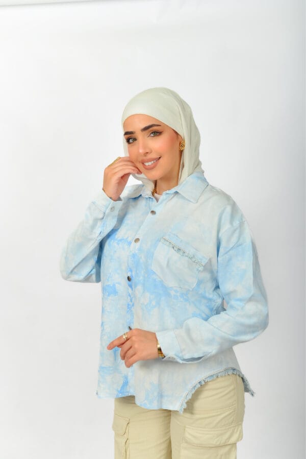 قميص جبردين نقوش ناعمة بتقنية الصباغة بالربط، وأزرار معدنية، وجيب أمامي بتفاصيل باهتة. يتميز بحاشية غير متماثلة وحواف منسلة لإطلالة عصرية مستوحاة من أسلوب البوهو.