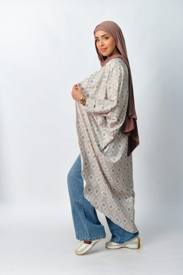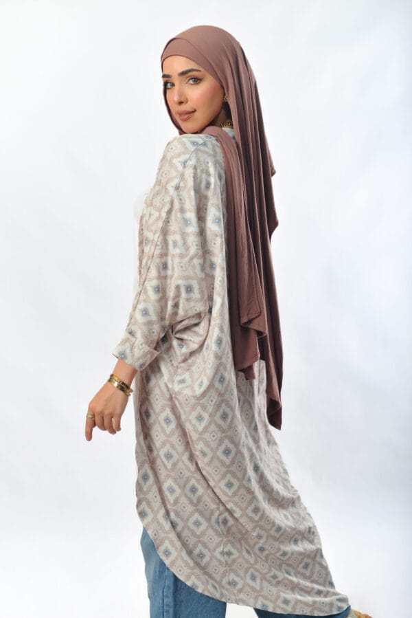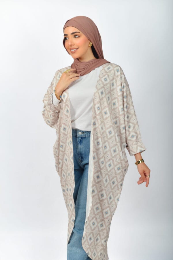 كاردي نسائي أنيق بقصة فضفاضة ونقشة هندسية ناعمة، مثالي للإطلالات اليومية أو الكاجوال الراقية، خامة مريحة وخفيفة مناسبة لكل المواسم.