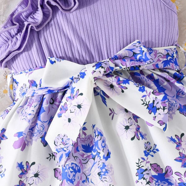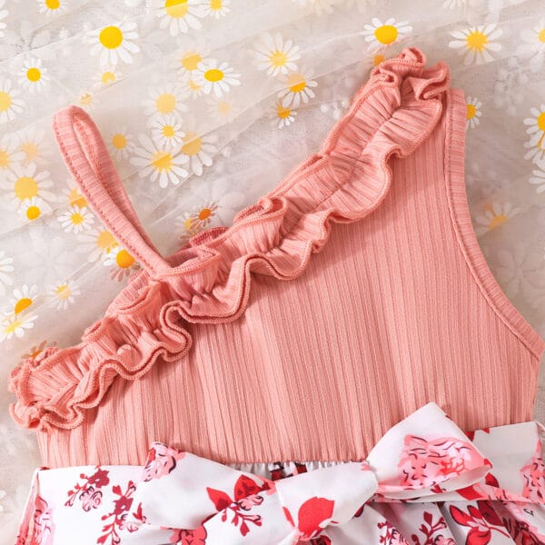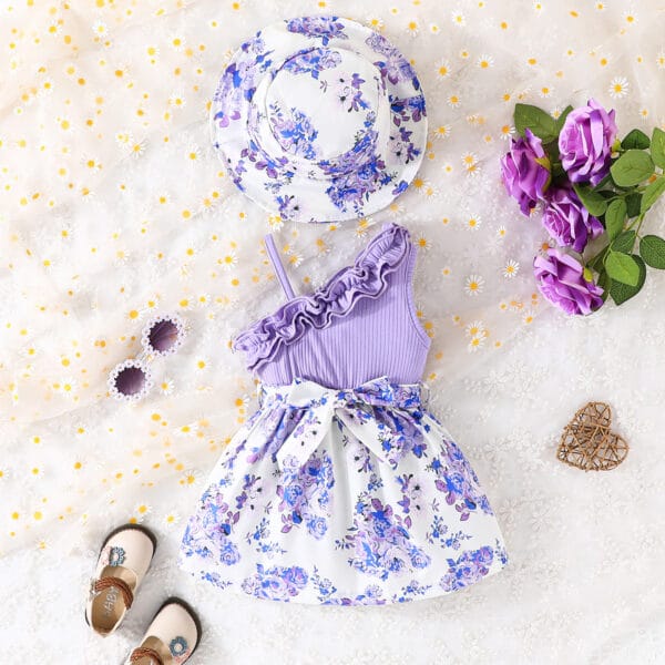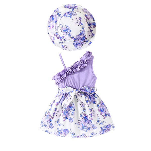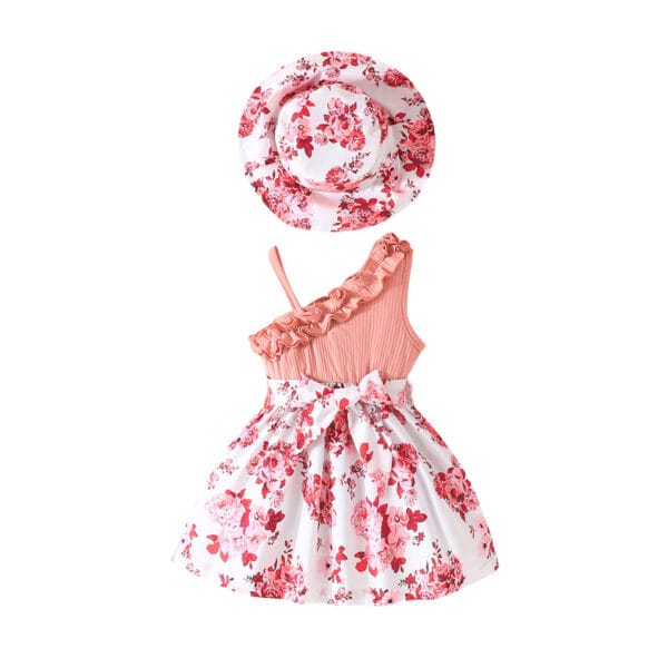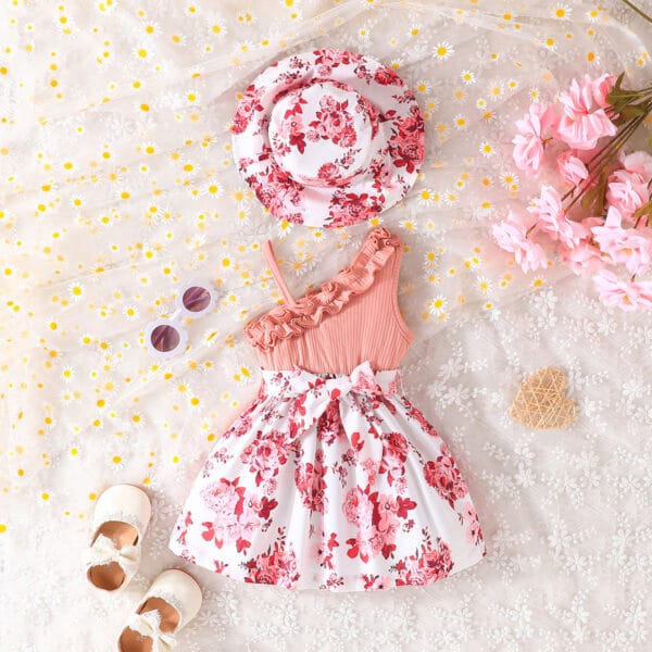 فستان صيفي أنيق للبنات بتصميم عصري مفعم بالأنوثة، يجمع بين لمسة من الرقي والبراءة. الجزء العلوي يأتي بكتف واحد مع كشكشة أنثوية رقيقة، بينما تنسدل التنورة بقماش مطبوع بالزهور الملونة مع ربطة خصر أنيقة تضفي لمسة ساحرة. يأتي مع قبعة مطابقة لمظهر متكامل يحمي من الشمس ويزيد من الأناقة. مثالي للنزهات، الحفلات، والمناسبات الصيفية الخاصة.