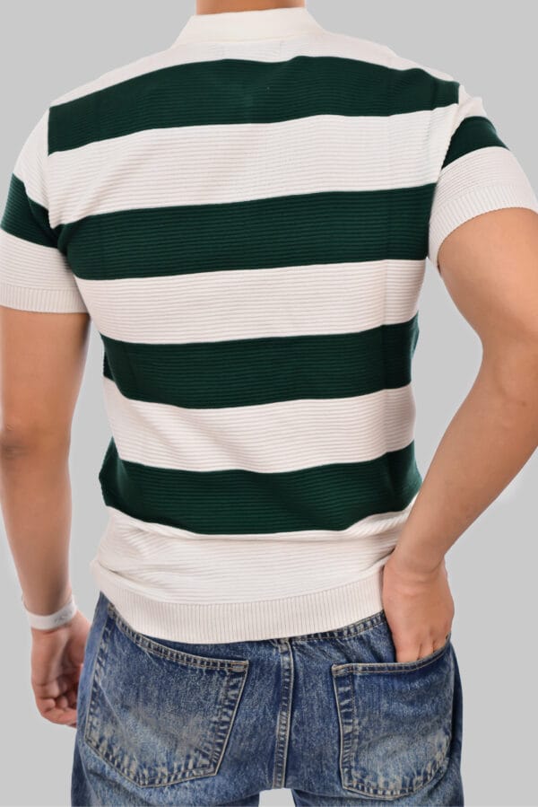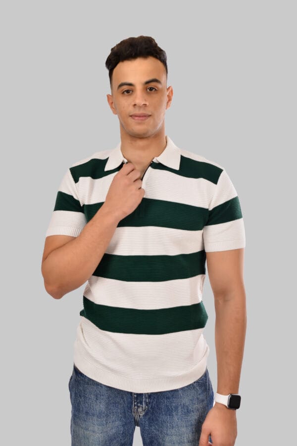 تي شيرت رجالي بنصف كم، يتميز بتصميم مخطط عرضي ، مع سحّاب قصير عند الياقة. القماش محاكٍ بتفاصيل بارزة تضيف لمسة فريدة، والتصميم مناسب للإطلالات الكاجوال الأنيقة.
