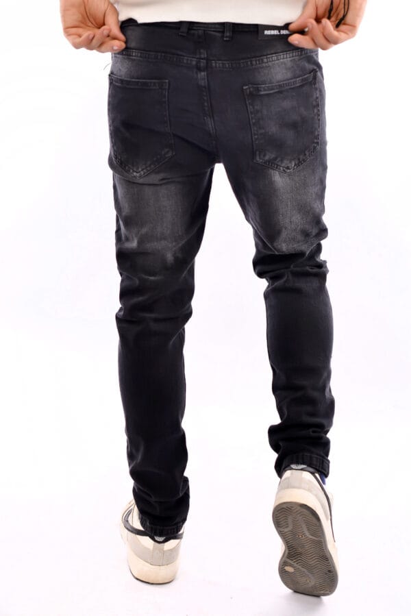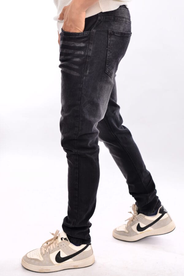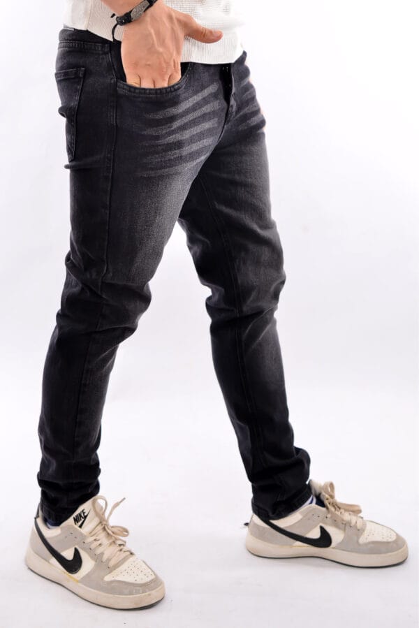 بنطلون جينز رجالي باللون الأسود ، يتميز بتأثير خطوط باهتة جانبية تضيف لمسة عصرية وجريئة. بقصة ضيقة (Slim Fit) تعزز الإطلالة الشبابية الكاجوال.