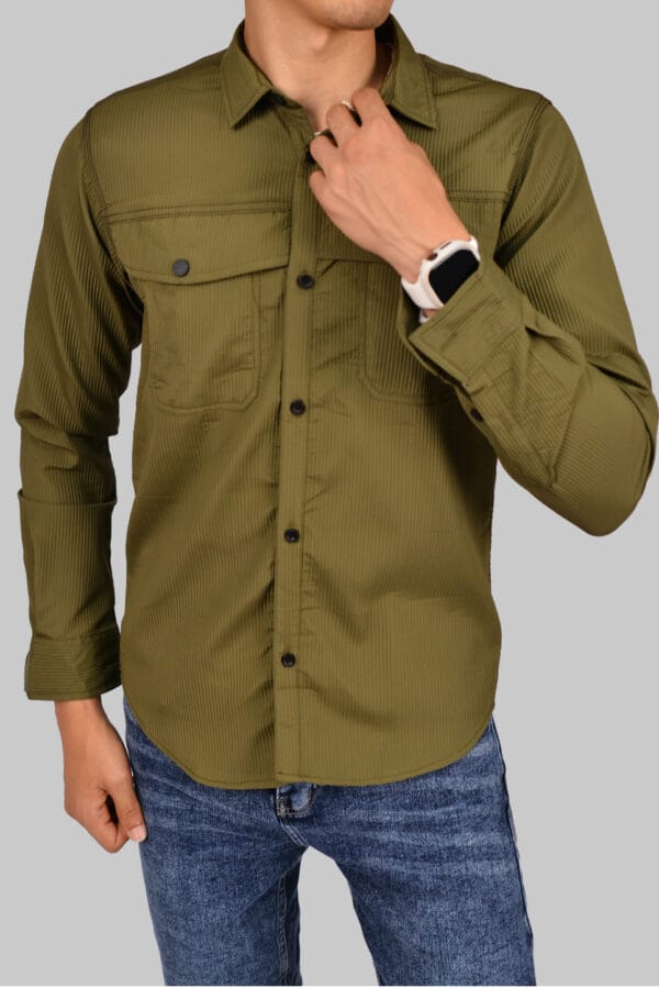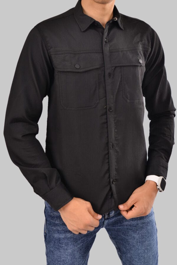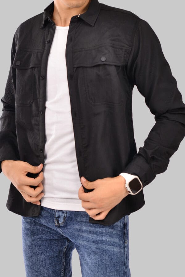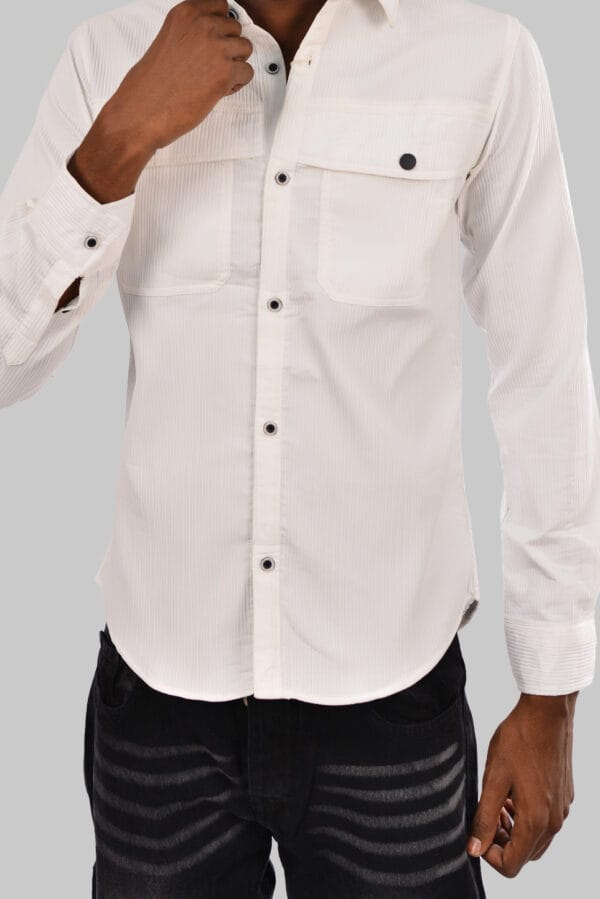قميص رجالي أنيق بلون بيج محايد، بتصميم كلاسيكي عملي يتميز بأزرار سوداء بارزة وجيبين أماميين بغطاء. القماش خفيف ومريح، بخطوط دقيقة تضيف له لمسة أناقة. مناسب للعمل، الاجتماعات أو الإطلالات الكاجوال الأنيقة.