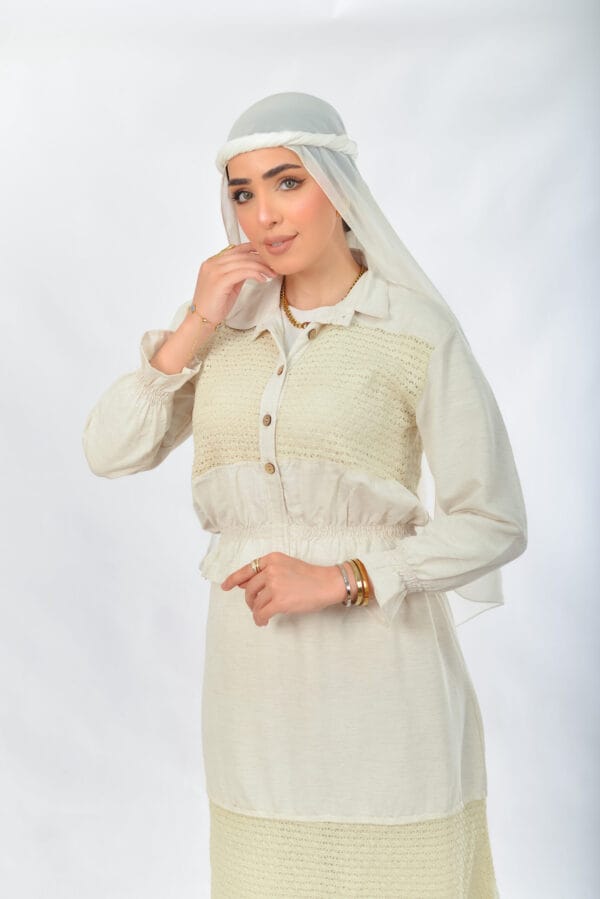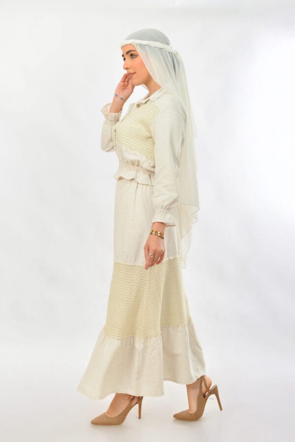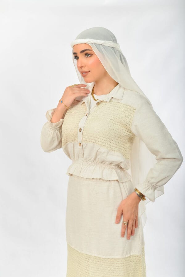 طقم أنيق وناعم من الكتان مكون من بلوزة وجيبه بلون البيج الكريمي بتصميم يجمع بين البساطة والفخامة. البلوزة بأكمام طويلة وأزرار أمامية، مزينة بلمسات قماش محاك تمنحها طابعاً تراثياً عصرياً، مع خصر مطاطي مزموم يبرز القوام بأنوثة وأناقة. الجيبة طويلة وواسعة، بتصميم مكون من طبقات بين القماش السادة والمحاك تضيف لمسة مميزة وانسيابية في الحركة. مثالي للإطلالات اليومية، أو المناسبات الهادئة والزيارات.