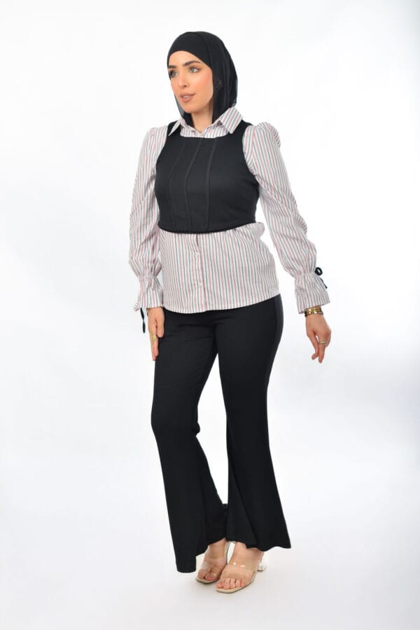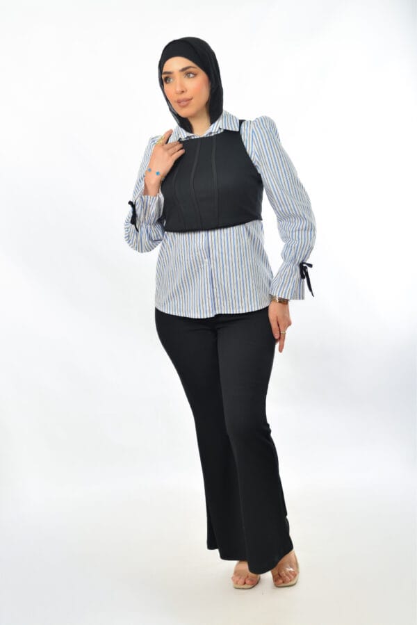 سوت نسائي مكوّن من 3 قطع أنيقة: قميص بوبلين مخطط بأكمام واسعة، كورسيه برباط خلفي، وبنطلون واسع. خامة البوبلين ناعمة ومريحة، والموديل عصري ومثالي للإطلالات اليومية أو الكاجوال الرسمي.