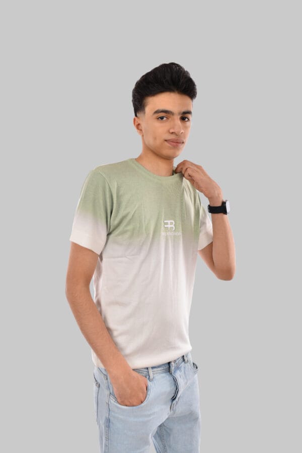تي شيرت رجالي أنيق بنصف كم، يتميز بتدرج لوني ناعم من الأخضر الفاتح في الأعلى إلى الأبيض في الأسفل، مع شعار مطرز في المنتصف يحمل اسم “Balenciaga”. القماش ناعم ومريح، وقصة التي شيرت كلاسيكية مناسبة للإطلالات اليومية أو الكاجوال العصرية.