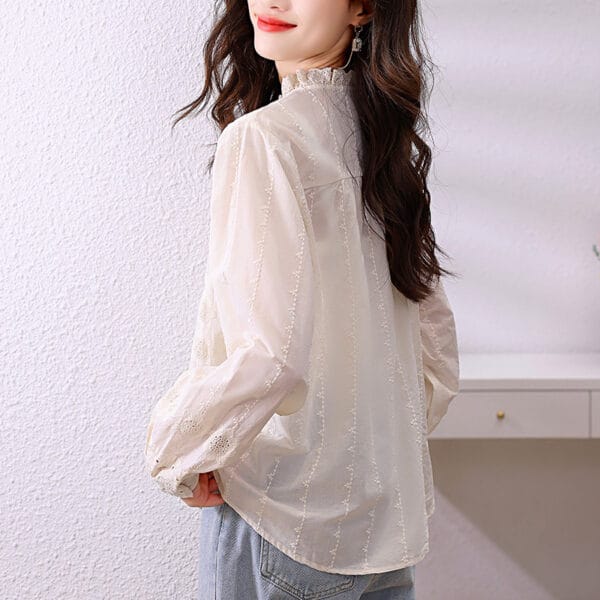 بلوزة نسائية أنيقة بلون أوف وايت، بتصميم دانتيل ناعم ونقوش ورود أنثوية. تتميز بياقة دائرية مزمومة وأزرار أمامية مخفية مع أكمام طويلة وأساور مزينة بتفاصيل دقيقة. مثالية للإطلالات الكلاسيكية أو الرسمية.