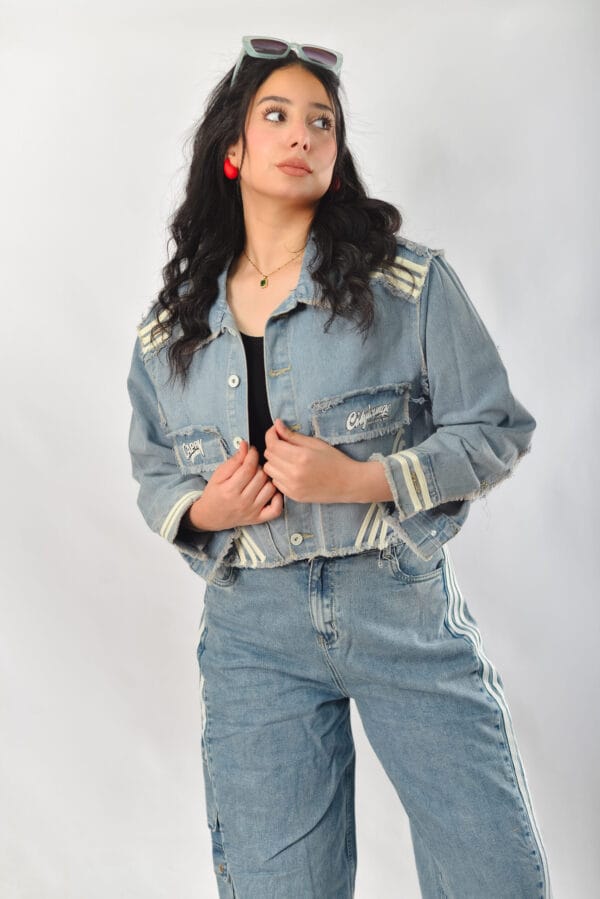 جاكيت جينز قصير (كروبد) بتصميم فينتاج، يتميز بأكمام واسعة وتفاصيل ممزقة (frayed) على الأطراف، بالإضافة إلى خطوط بيضاء تزين الأكمام وأجزاء من الجاكيت، مما يمنحه لمسة رياضية وعصرية. الجاكيت باللون الأزرق الفاتح ويظهر فيه بعض التفاصيل مثل الأزرار الأمامية وجيوب الصدر.