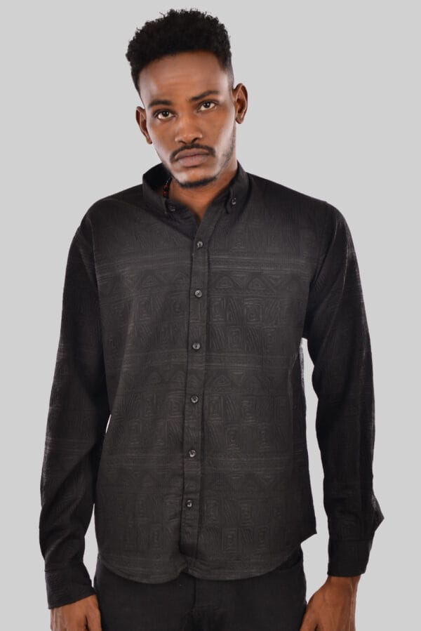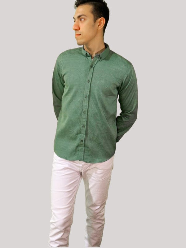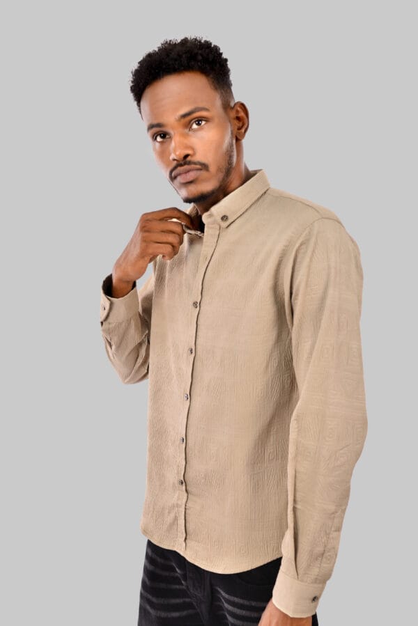 قميص رجالي بأكمام طويلة بلون هادئ، يتميز بنقشة بارزة تضيف لمسة من الأناقة والتميز. تصميم كلاسيكي بأزرار أمامية وياقة بأزرار جانبية، مثالي للإطلالات اليومية أو الرسمية الخفيفة. خامة مريحة تناسب جميع الفصول.
