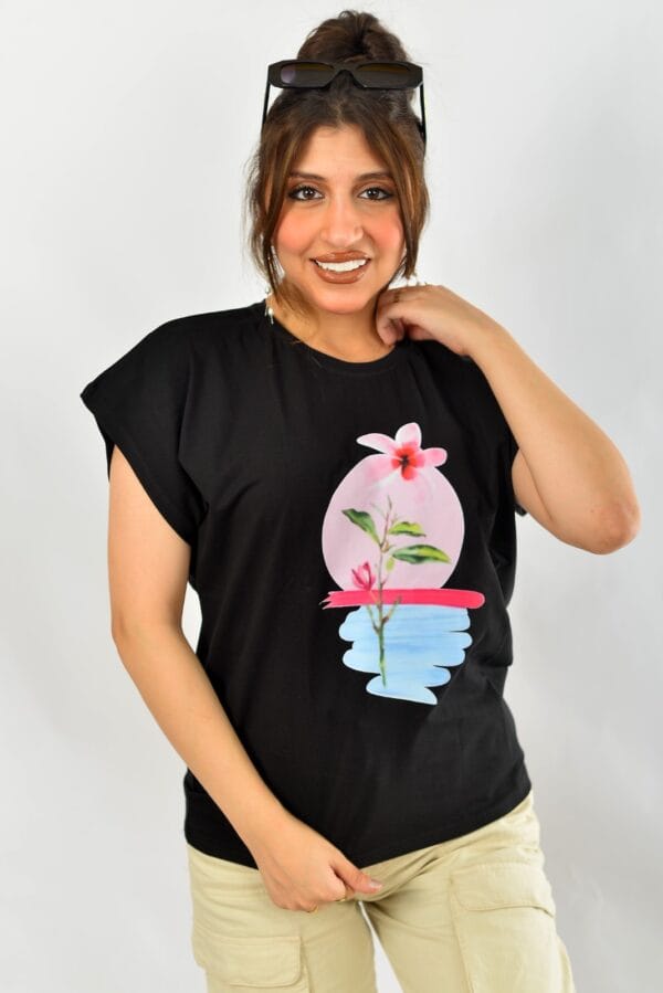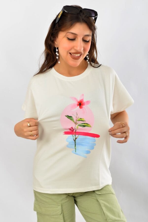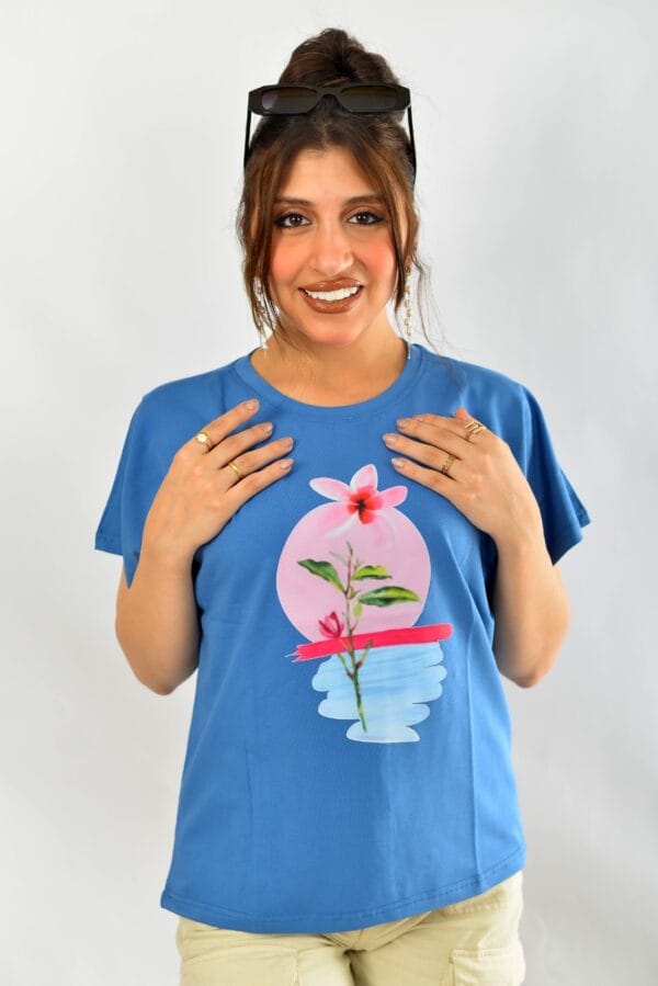 تيشيرت “لافا” باللون الفوشيا الزاهي، مطبوع عليه رسمة زهرية رقيقة داخل دائرة باستيل ناعمة. خامة قطنية ناعمة وتصميم عصري يمنحك إطلالة منعشة ومليئة بالحيوية.