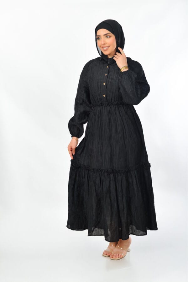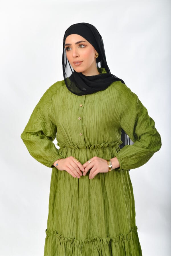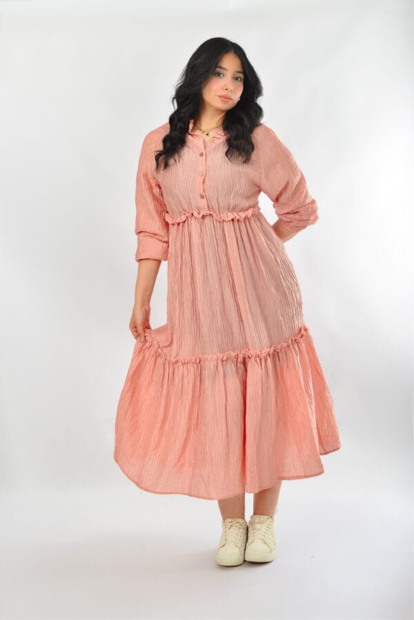 فستان أنيق ، يتميز بتصميم واسع ومريح بستايل كاجوال أنثوي. مع أزرار أمامية وتفاصيل كشكش ناعمة، مثالي للإطلالات اليومية في الربيع والصيف.