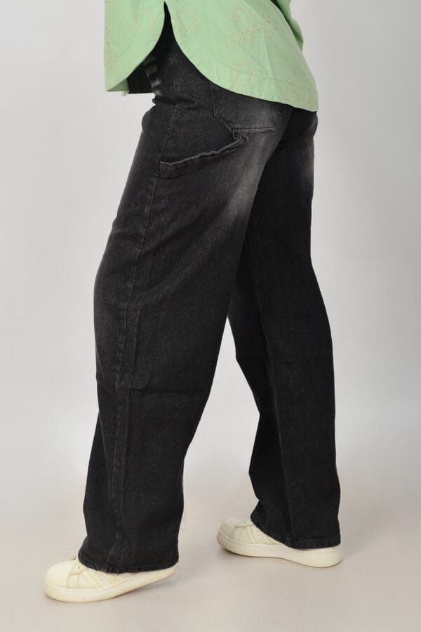 بنطلون جينز أسود فضفاض (Loose/Wide-leg) أو بقصة واسعة، يتميز بلون أسود ، مما يمنحه مظهرًا عصريًا ومريحًا. ذو خصر مرتفع أو متوسط، و تظهر فيه بعض التفاصيل الخفيفة مثل مناطق باهتة (faded areas).