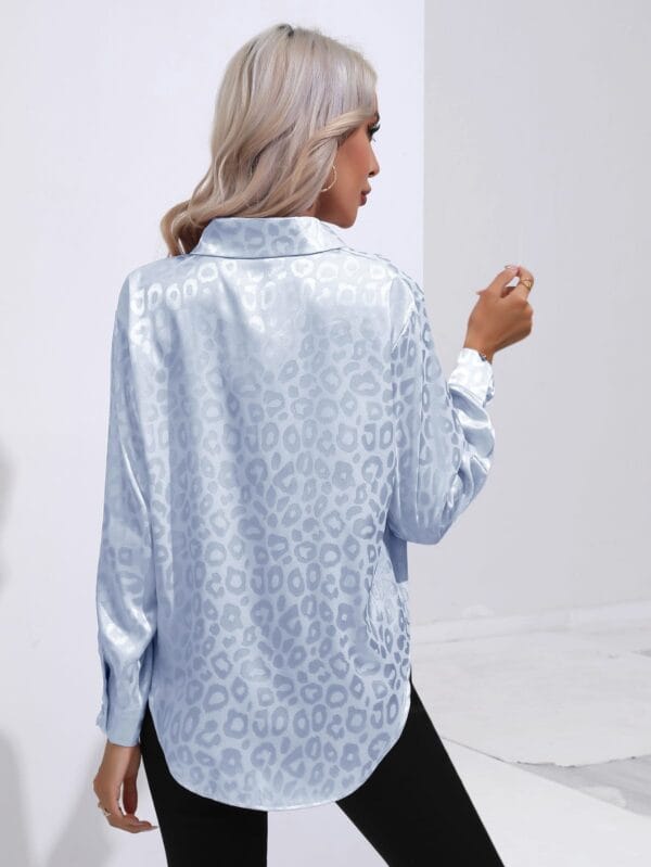 بلوزة حريرية أنيقة مصممة بأناقة فائقة لتمنحك إطلالة ناعمة وعصرية. مصنوعة من قماش ساتان فاخر بلمعة ناعمة ونقشة ليوبارد مخفية في نفس اللون تضيف لمسة جريئة وراقية في آن واحد. تأتي بقصة كلاسيكية بأزرار أمامية وياقة رسمية، مما يجعلها مثالية للإطلالات الرسمية أو الكاجوال الأنيق.