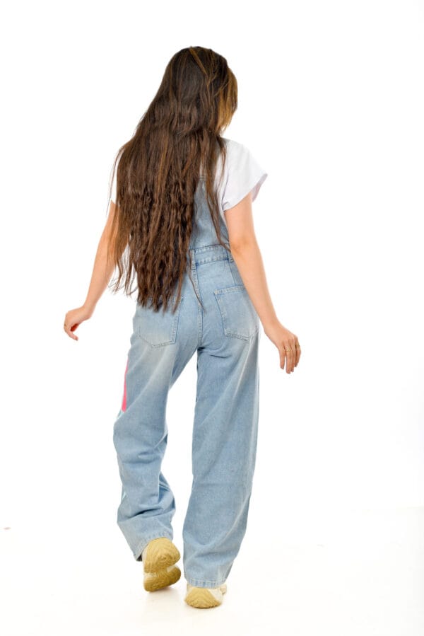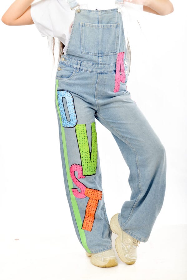 سلوبيت جينز عصري بتصميم واسع مريح، مزين بحروف ملونة بارزة ولامعة على الساق تضيف لمسة مرحة وجريئة. مثالي للإطلالات الشبابية والكاجوال اليومية.