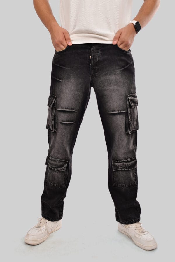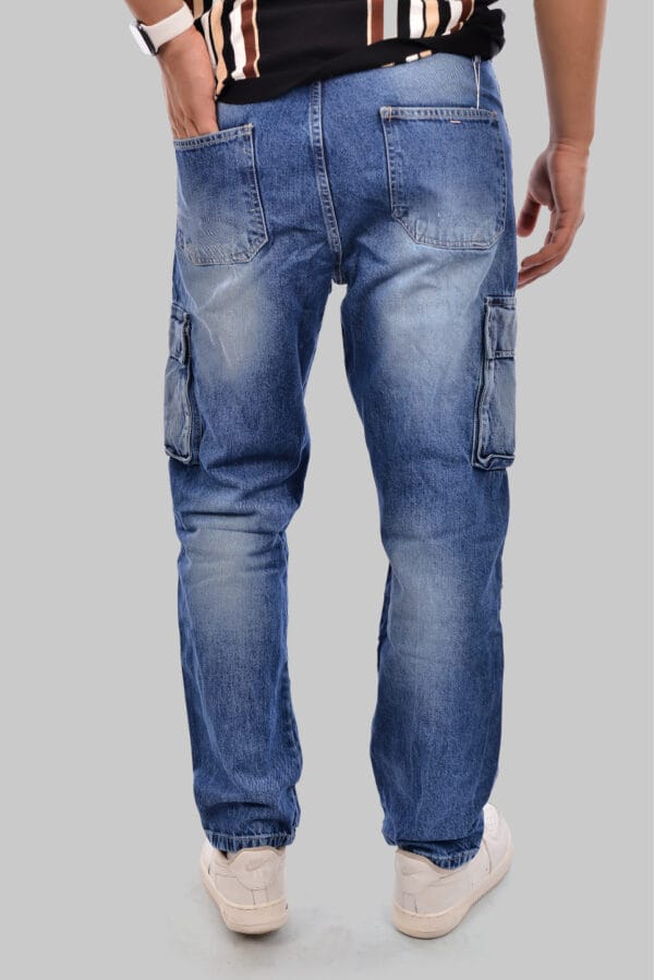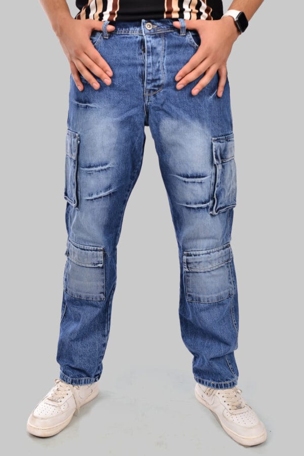 بنطلون جينز رجالي بتصميم كارغو عصري، مزود بجيوب جانبية متعددة لعملية أكبر ومظهر شبابي. تفاصيل الغسيل المموه، مما يمنحه لمسة كاجوال ومريحة. مثالي للإطلالات اليومية والرحلات الخارجية.