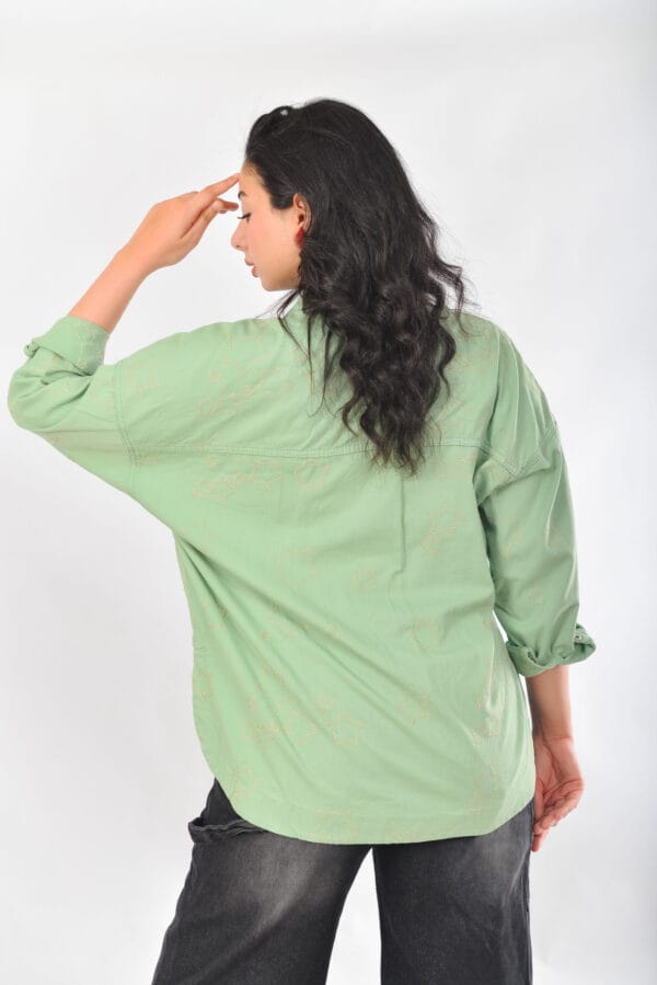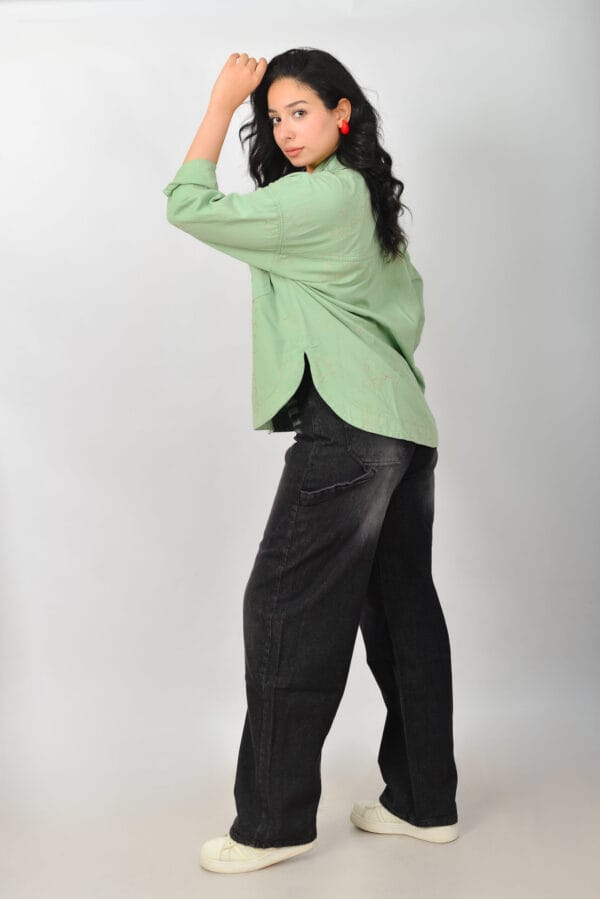 شميز جبردين أنيق بلون أخضر فاتح، يتميز بتصميم مريح وأزرار أمامية مع تطريز ناعم على شكل نجوم. مثالي للإطلالات اليومية العصرية.