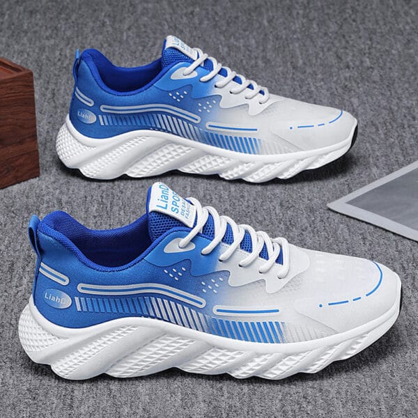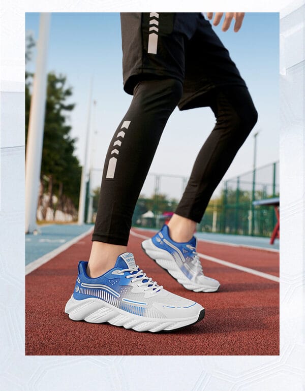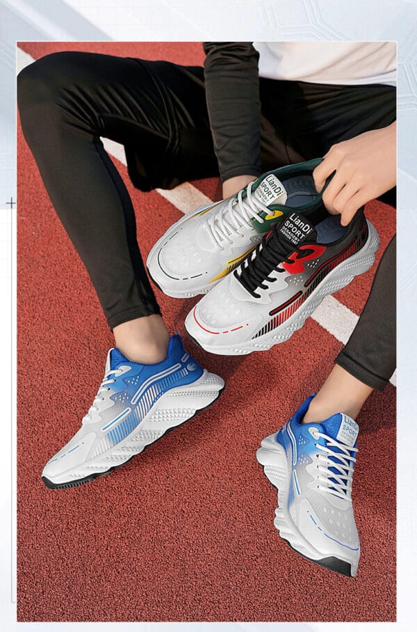 حذاء رياضي عصري بتصميم ديناميكي أنيق، يتميز بجزء علوي مهوّى وألوان جريئة، مع نعل سميك مريح لامتصاص الصدمات ودعم القدم أثناء الحركة.