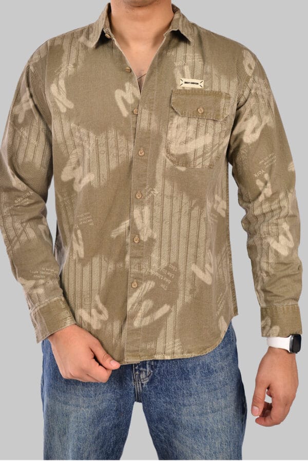 قميص رجالي بأكمام طويلة بلون زيتي فاتح مع نقشات غير منتظمة باللون البيج، بتفاصيل مطبوعة تعطيه مظهرًا عصريًا وجريئًا. يحتوي على جيب أمامي بغطاء وأزرار بنفس اللون، مصنوع من قماش مريح يناسب الإطلالات الكاجوال اليومية.