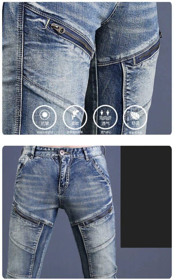 بنطلون جينز عصري بقصّة ضيقة (Slim Fit) وتصميم فريد مستوحى من الستايل البايكر، يتميز بخياطة بارزة وتدرجات غسيل مميزة تعزز من المظهر العصري. يحتوي على سحابات زخرفية تضيف لمسة جريئة، ويجمع بين الراحة والأناقة في آنٍ واحد. مثالي للإطلالات الكاجوال اليومية.