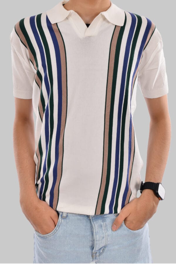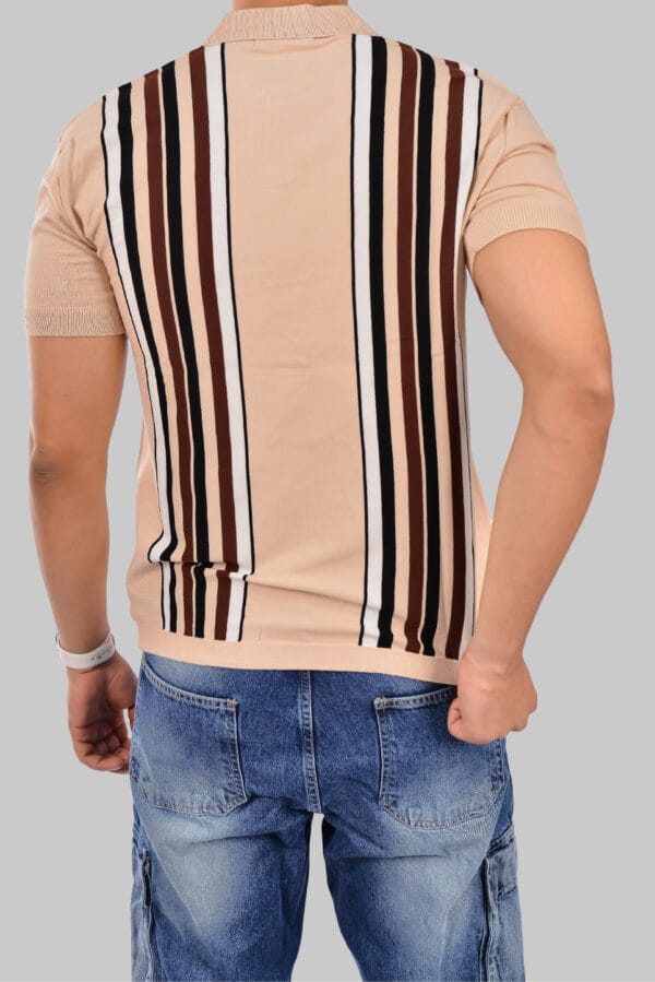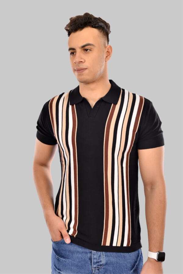 تي شيرت رجالي بنصف كم، مع تصميم شرائط رأسية عصرية على الجانبين. يتميز بقصة أنيقة وخامة مريحة تعطي مظهرًا يجمع بين الكلاسيكية والموضة العصرية، مناسب للارتداء اليومي أو الخروجات الكاجوال الراقية.
