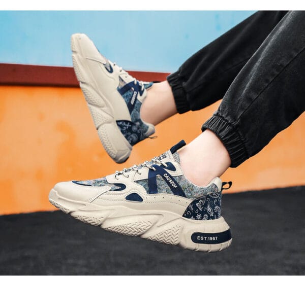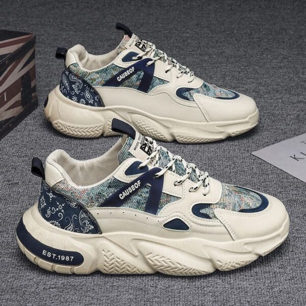 حذاء رياضي عصري بتصميم فريد يجمع بين خامات متعددة وألوان كريمية وأزرق مطبوع، يتميز بنعل عريض ومريح، مثالي للإطلالات اليومية والكاجوال العصرية.