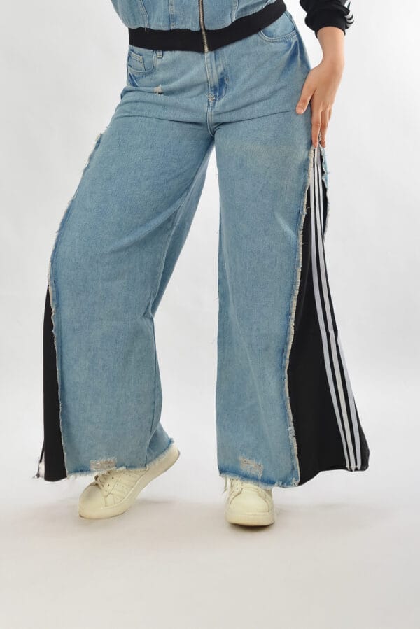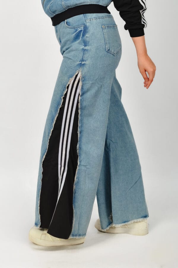 بنطلون جينز واسع بتصميم عصري جريء، مزود بشق جانبي كبير يكشف عن طبقة داخلية من قماش ميلتون الرياضي باللون الأسود مع خطوط بيضاء، يجمع بين الكاجوال والستايل الرياضي في قطعة واحدة مثالية للشباب ومحبي الموضة.