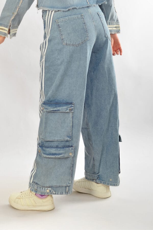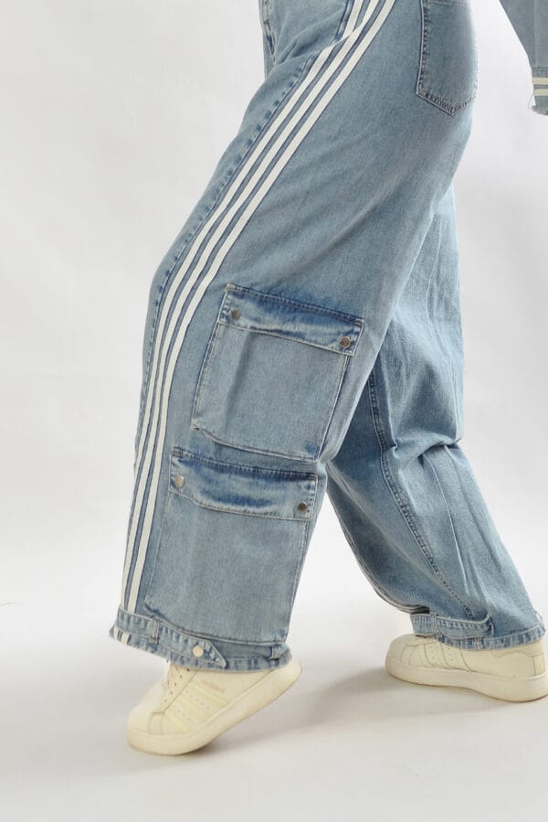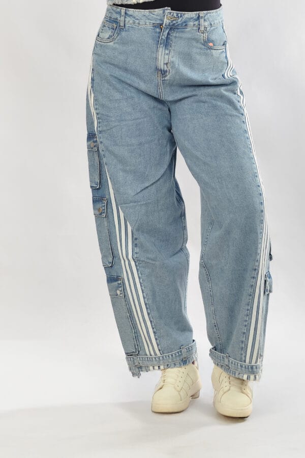 بنطلون جينز واسع بستايل كارغو وعصري، مزود بخطوط بيضاء جانبية وجيوب أمامية كبيرة، مثالي لإطلالة مريحة ومرنة تجمع بين الكاجوال والستايل الرياضي.